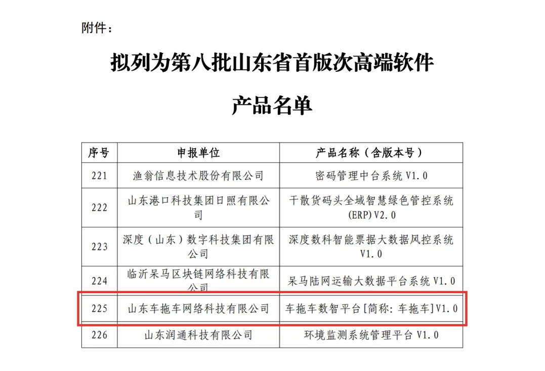 山东省工信厅公示了第八批山东省首版次高端软件产品名单,山东车拖车网络科技有限公司自主研发的“车拖车数智平台【简称:车拖车】”软件产品成功入选。