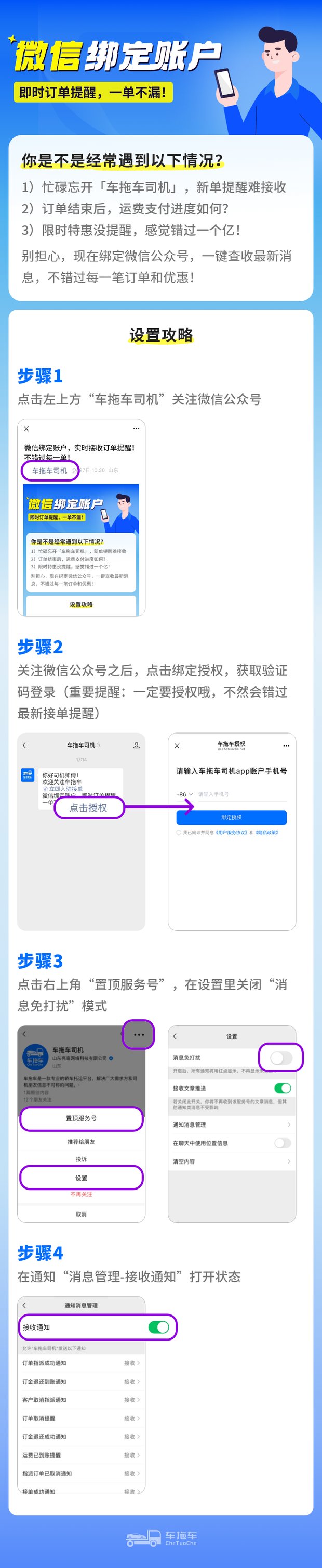 微信绑定“车拖车司机”微信公众号,一键查收新订单、运费进度、福利活动等最新消息,再也不怕错过订单和优惠啦!具体操作如下: