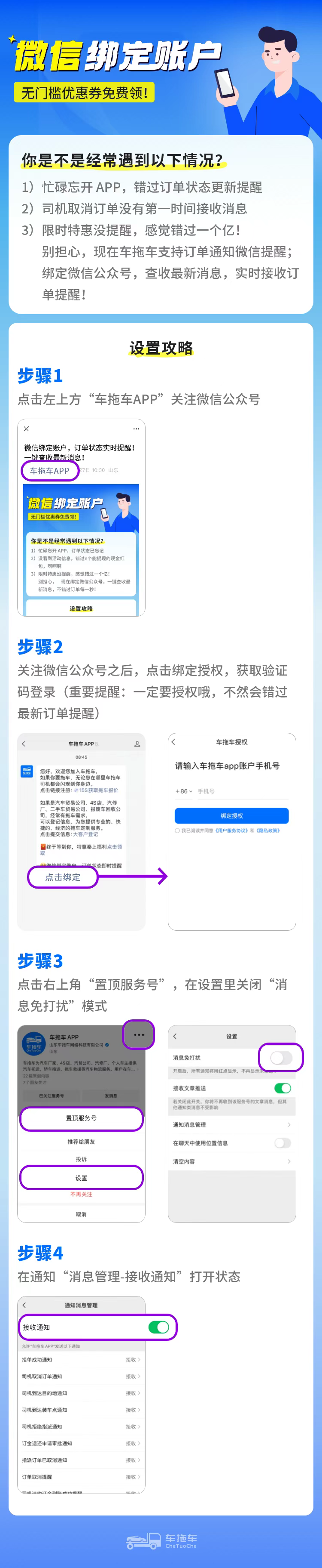 绑定“车拖车APP”微信公众号,一键查收订单状态提醒、福利活动等最新消息